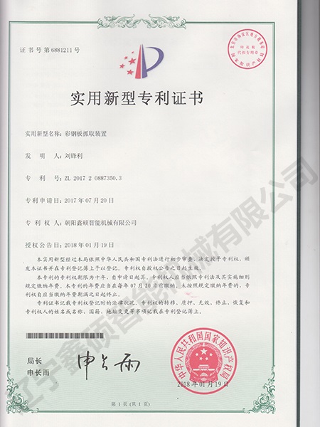 Utility model certificate of color steel plate grabbing device